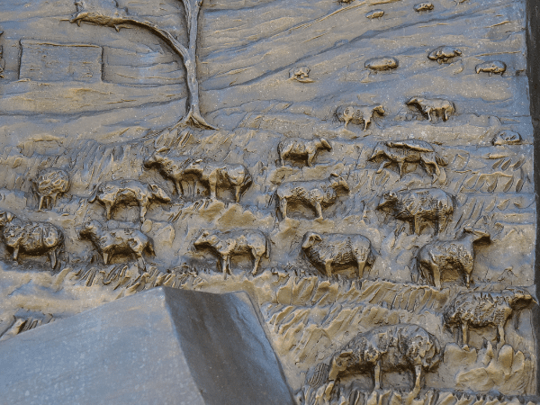 To the flockās left, a shepherd celebrates finding his one lost sheep (Luke 15:5).