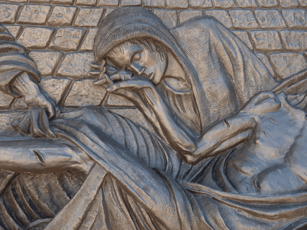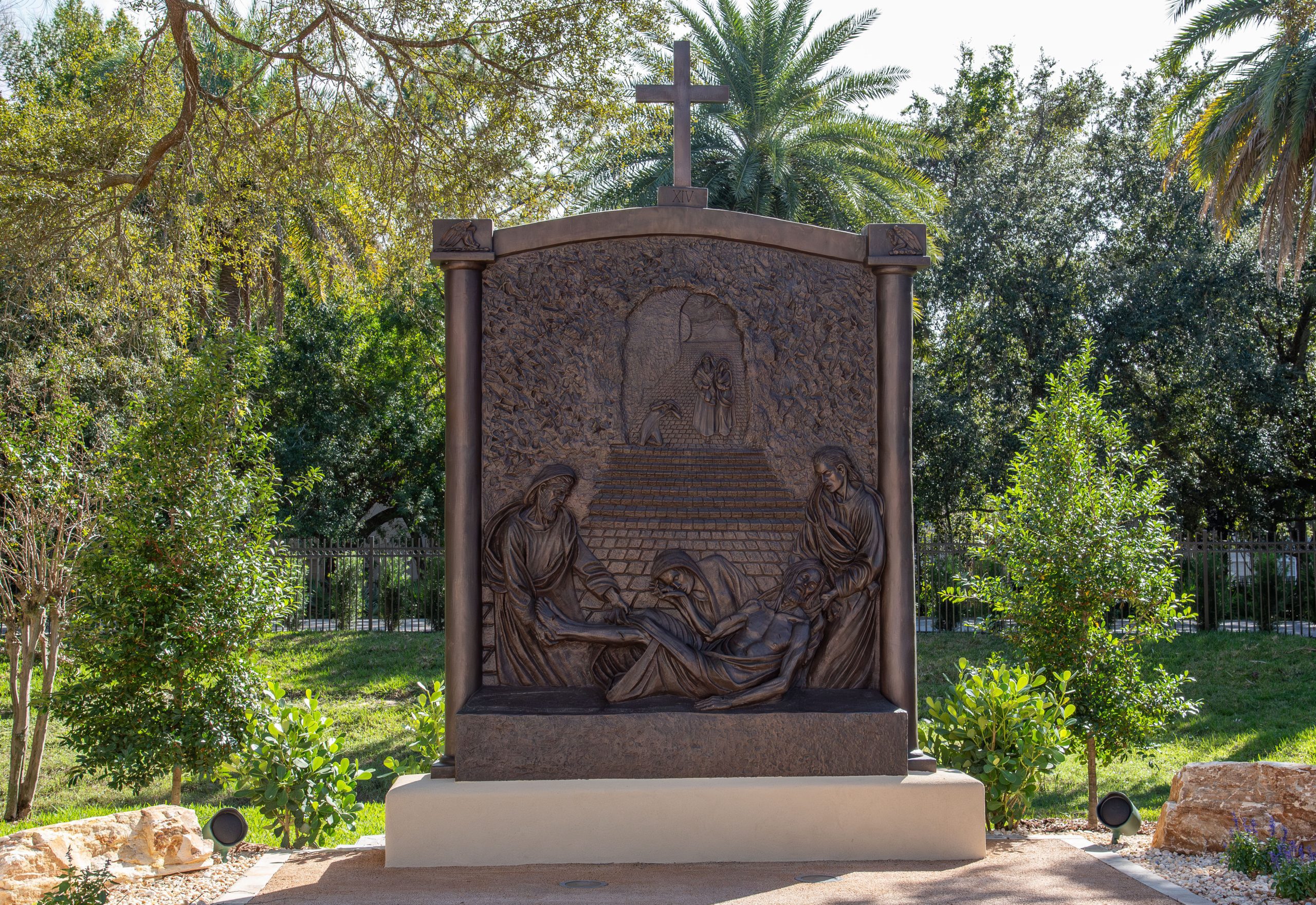 Station Description: Mary holds the hand of Jesus as He is laid in the tomb.