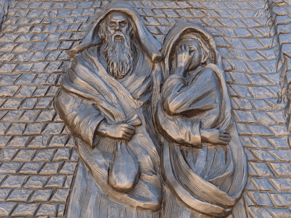 To her right, Nicodemus carries a bag of myrrh and aloes for the burial (John 19:39).