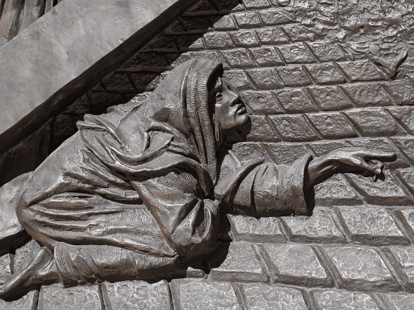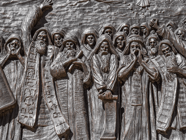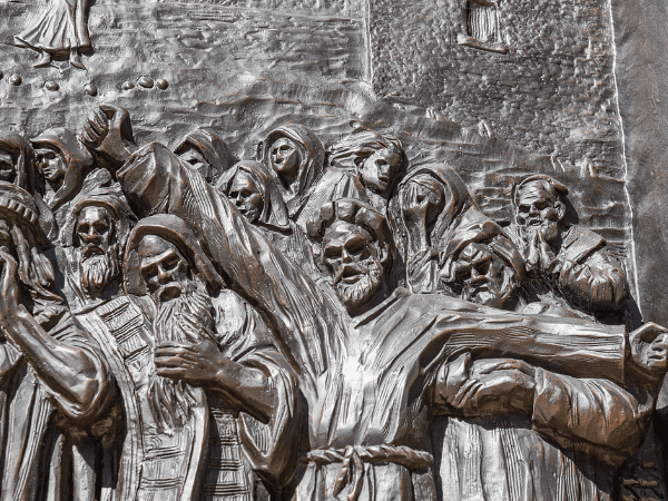 Roman soldiers congregate on the left while the Pharisees gather on the right.