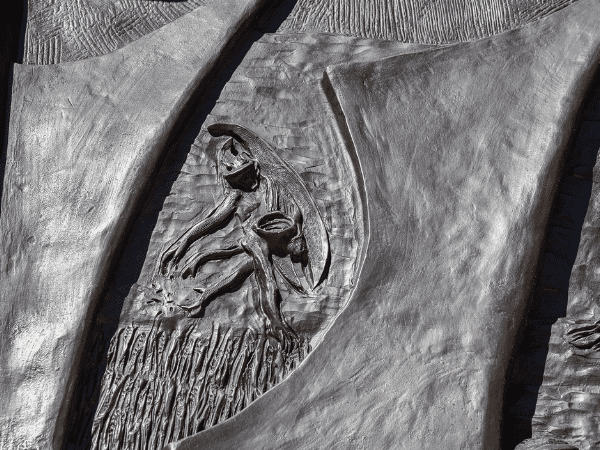 To the right, an adulterous woman stands alone surrounded by a circle of stones (John 8:3-11).