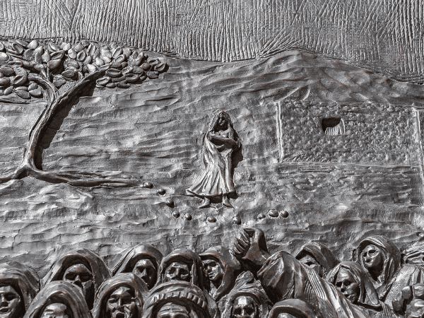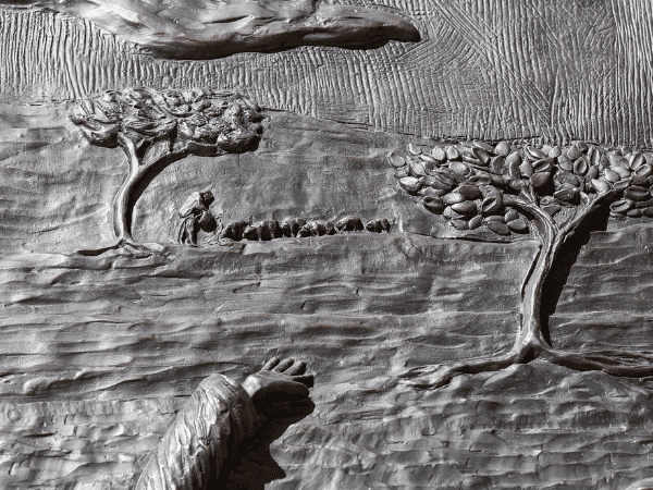 Station Description: In the final fall of Jesus, a demon presses the cross down upon Him. Christ raises His face in agony. The crowd is now further off in the distance.