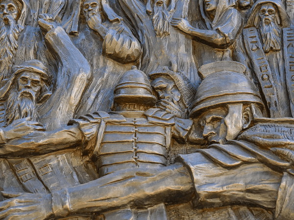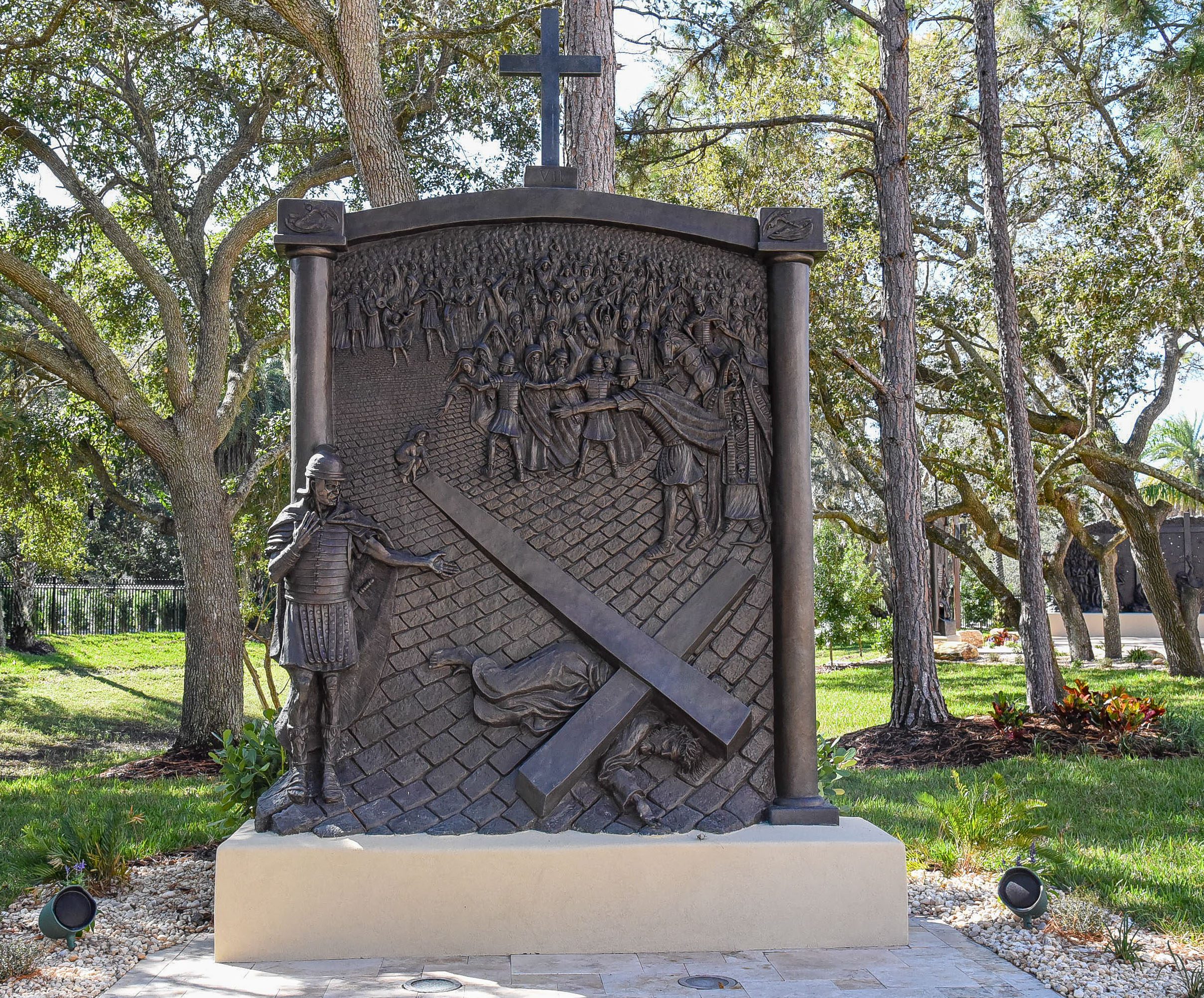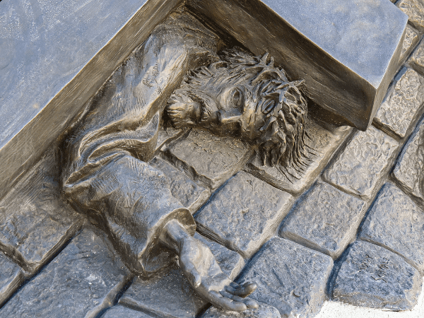 Station Description: Jesus is crushed by the cross as He falls again. A Roman soldier motions to the viewer to look upon the fallen Christ, as Jesus looks and reaches out to the viewer.