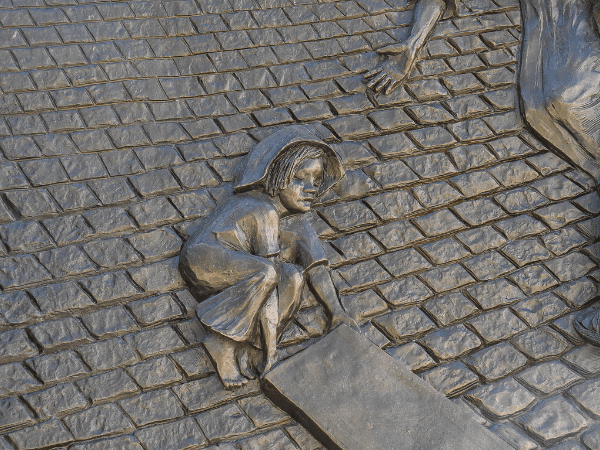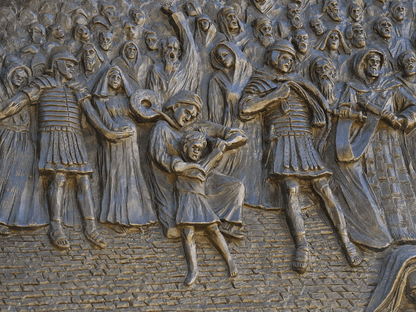 On the left, a little girl breaks away from the angry crowd and desperately tries to lift the cross off Jesus.