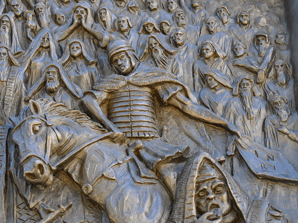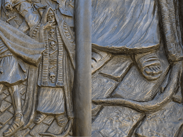 Behind him, a Roman soldier carries the parchment with INRI written on it. The soldier sticks his tongue out at Jesus and uses the bridle in his horse’s mouth to turn its head (James 3:3, 6-10).