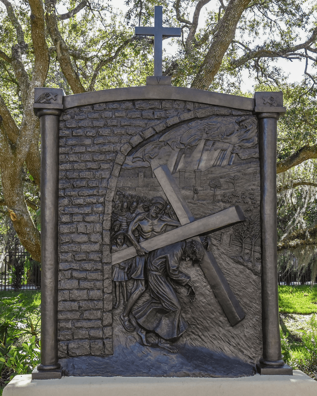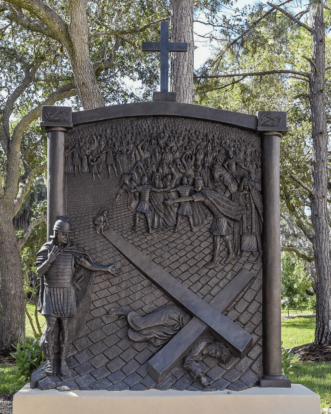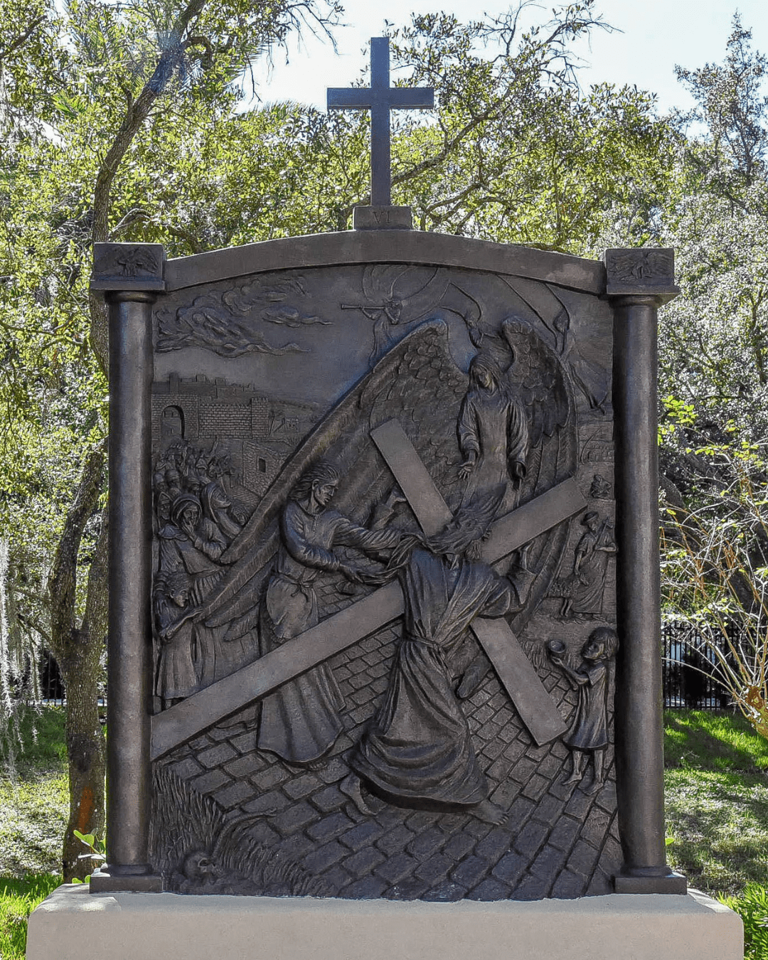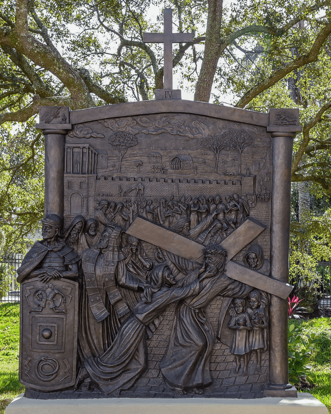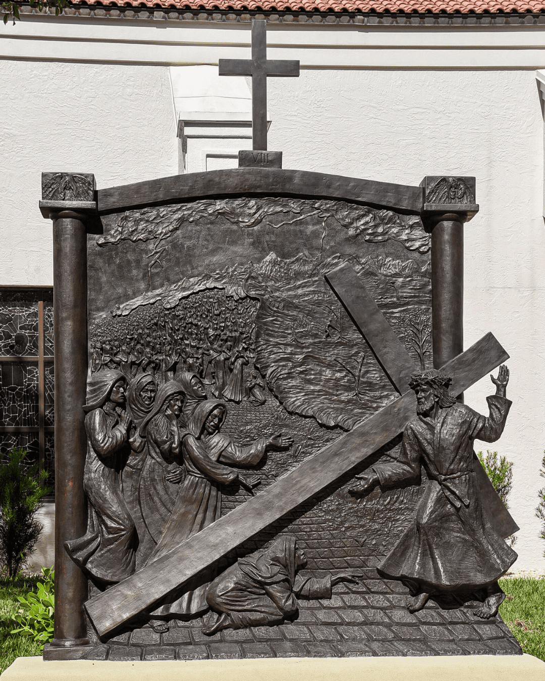 Station Description: Jesus calmly meets the women of Jerusalem who have shown deep faith in following Him. The crowd of women is diverse: young women, carrying their infants, stand together with their elders whose wise, wrinkled face are deeply saddened. Some women kneel in prayer, others close their eyes with hands clasped, and some are distraught and weeping. Some turn their eyes to Jesus and others to Heaven.