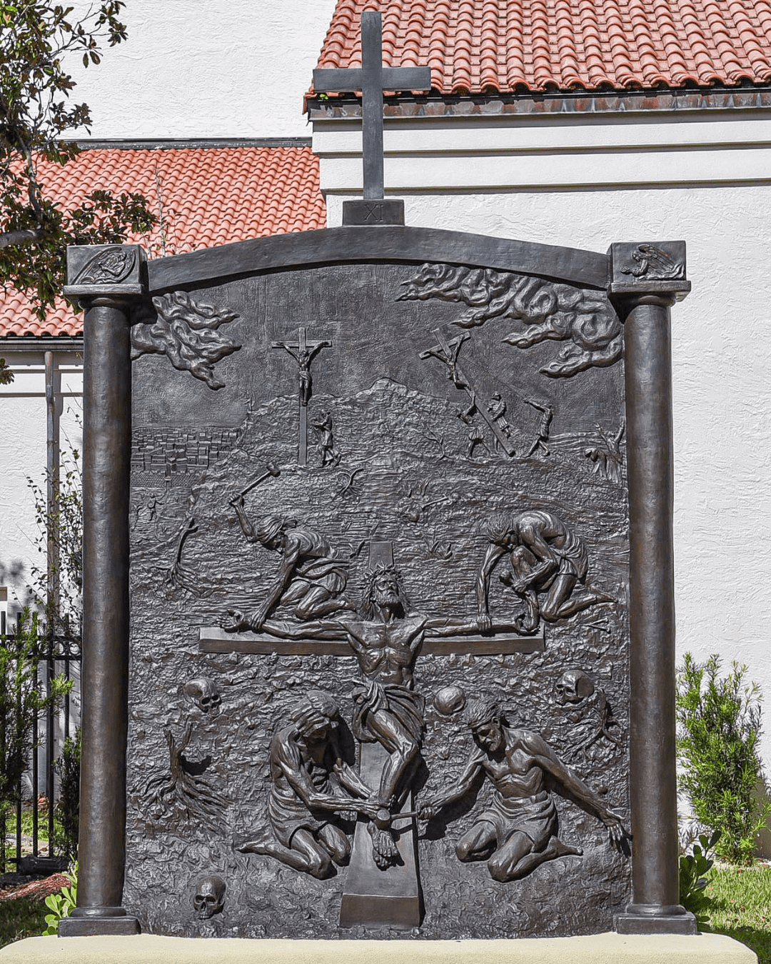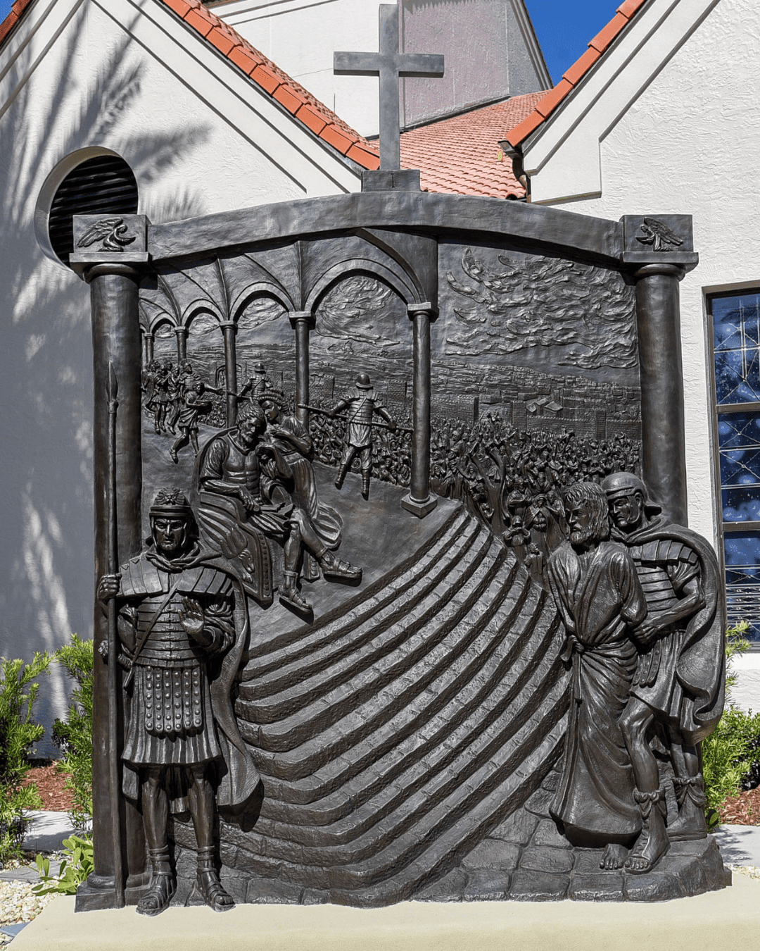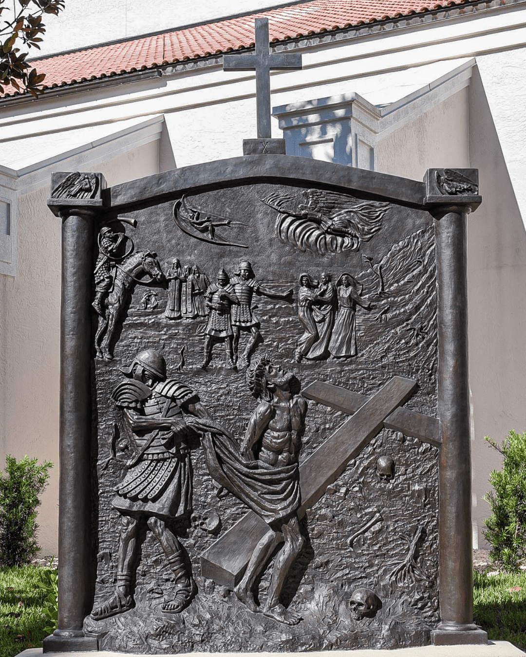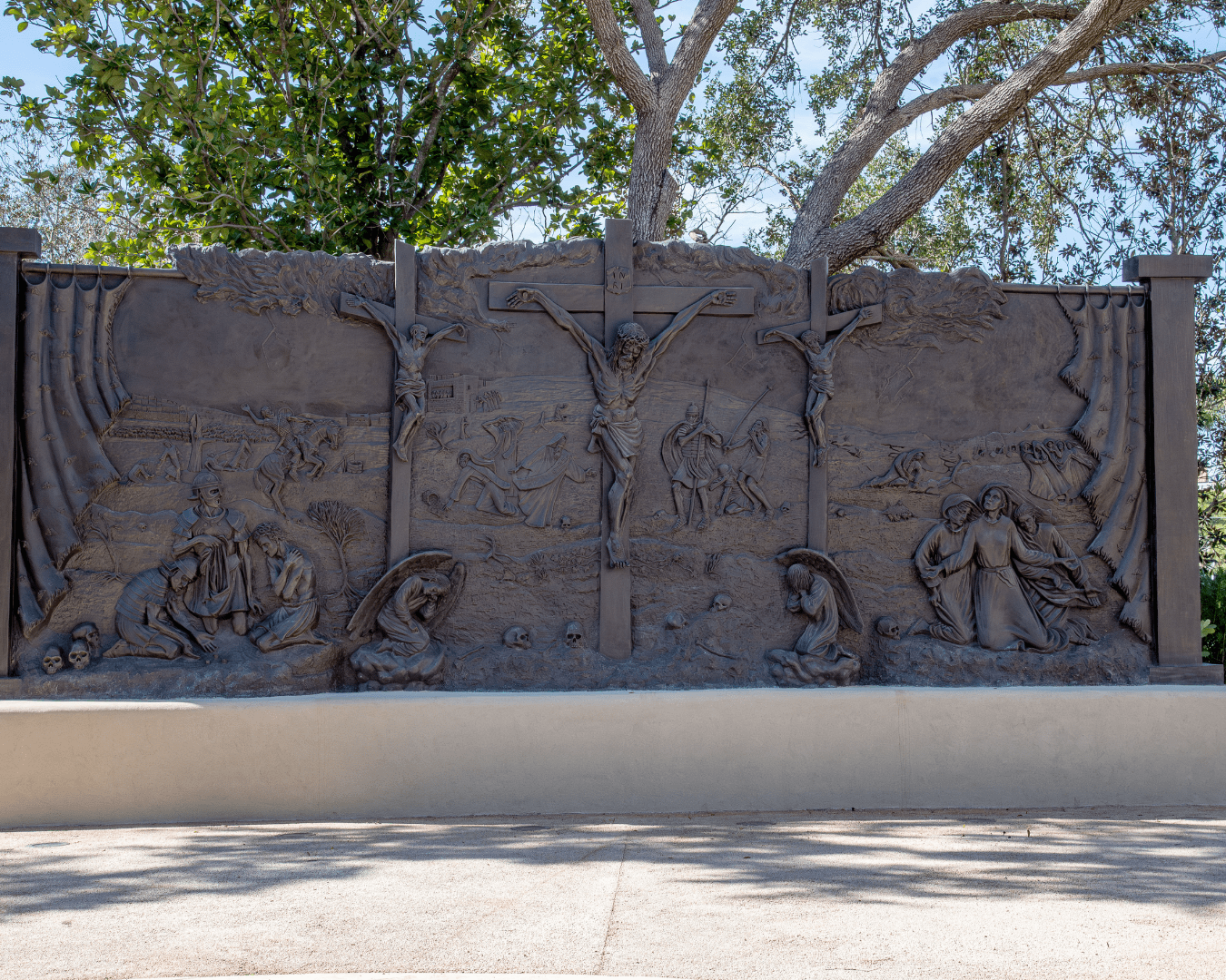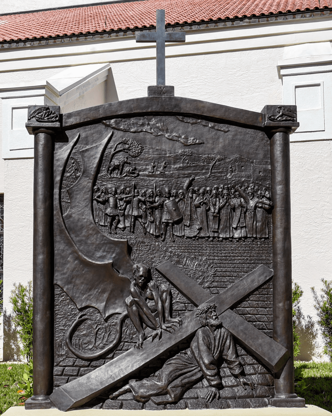 Station Description: Jesus calmly meets the women of Jerusalem who have shown deep faith in following Him. The crowd of women is diverse: young women, carrying their infants, stand together with their elders whose wise, wrinkled face are deeply saddened. Some women kneel in prayer, others close their eyes with hands clasped, and some are distraught and weeping. Some turn their eyes to Jesus and others to Heaven.